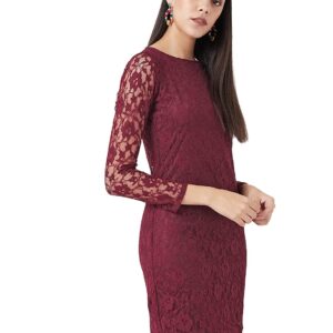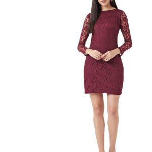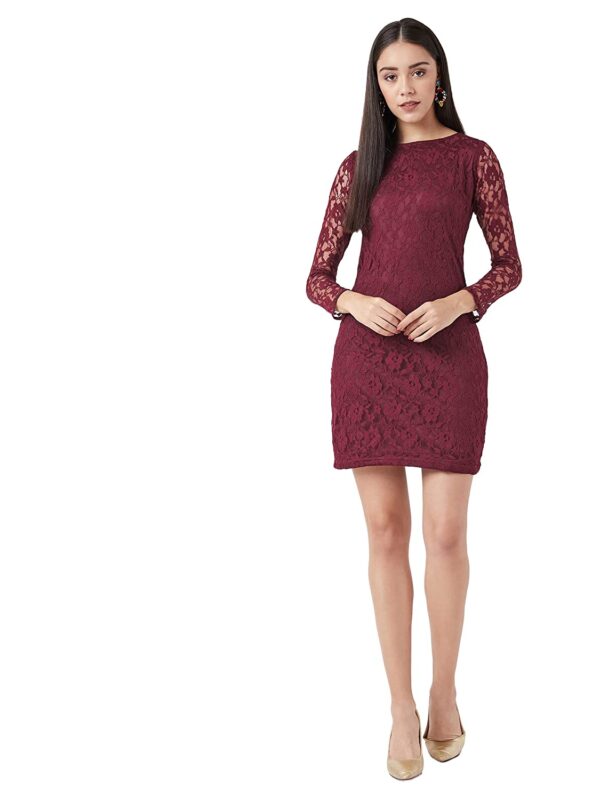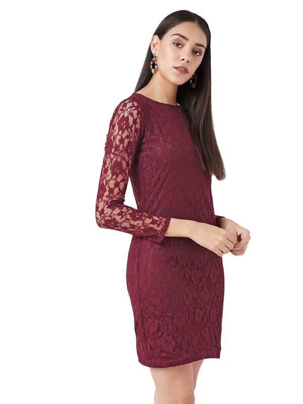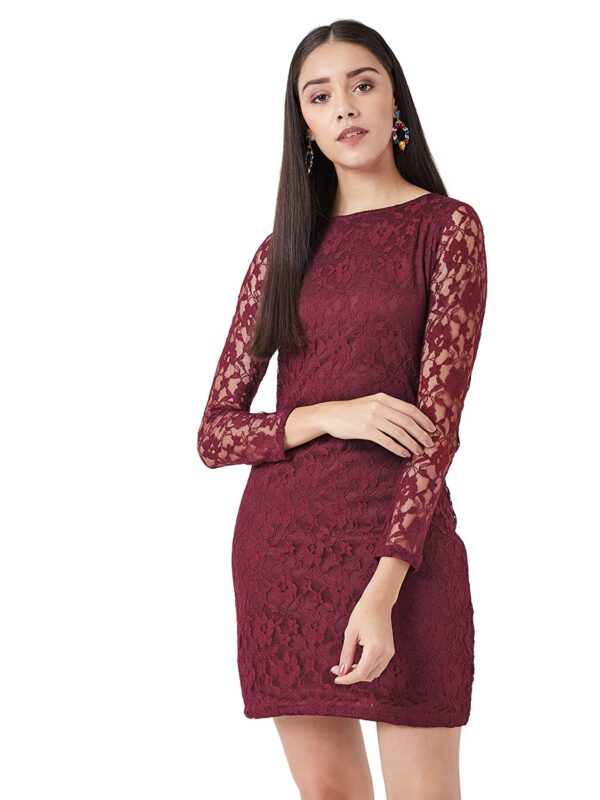 This solid lace mini bodycon dress, Has a round neck and full sleeves, Has a zipper closure